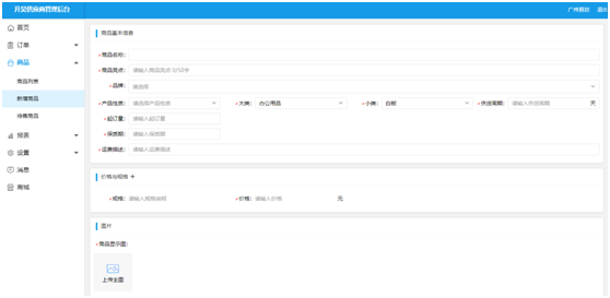 新增商品栏,所有星号栏都是必填项,确保每个产品的信息完善,准确,最后提交平台管理后台审批。 产品图片3-5张,正面,侧面,显示产品logo等图片 图片规格要求:文件格式,分辨率 商品主图: 750*750 详情图:790*1046(详情图没有特定长度的,设计是自动拉伸的)